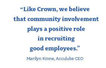 “Like Crown,” says Acculube CEO Marilyn Kinne, “Acculube emphasizes employee development and growth. And like Crown, we believe that community involvement plays a positive role in recruiting good employees.”